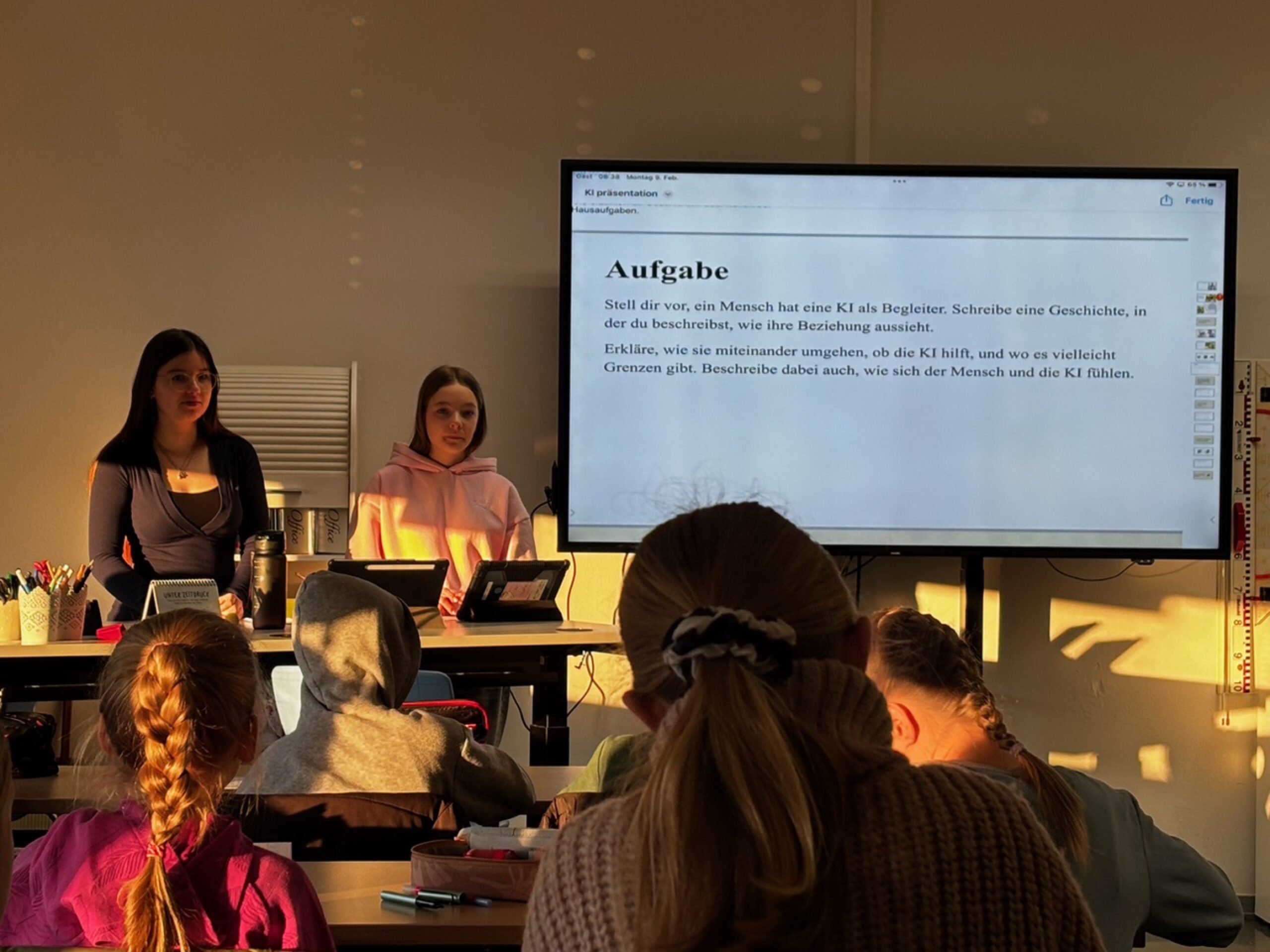 Die Medienscouts Pia und Clara erklärten anschaulich, wie KI beim Lernen unterstützen kann und worauf dabei zu achten ist. Dabei wurde betont, dass digitale Werkzeuge verantwortungsvoll eingesetzt werden müssen. Der Austausch auf Augenhöhe förderte zahlreiche Nachfragen und zeigte das große Interesse der Schülerinnen und Schüler an digitalen Zukunftsthemen.