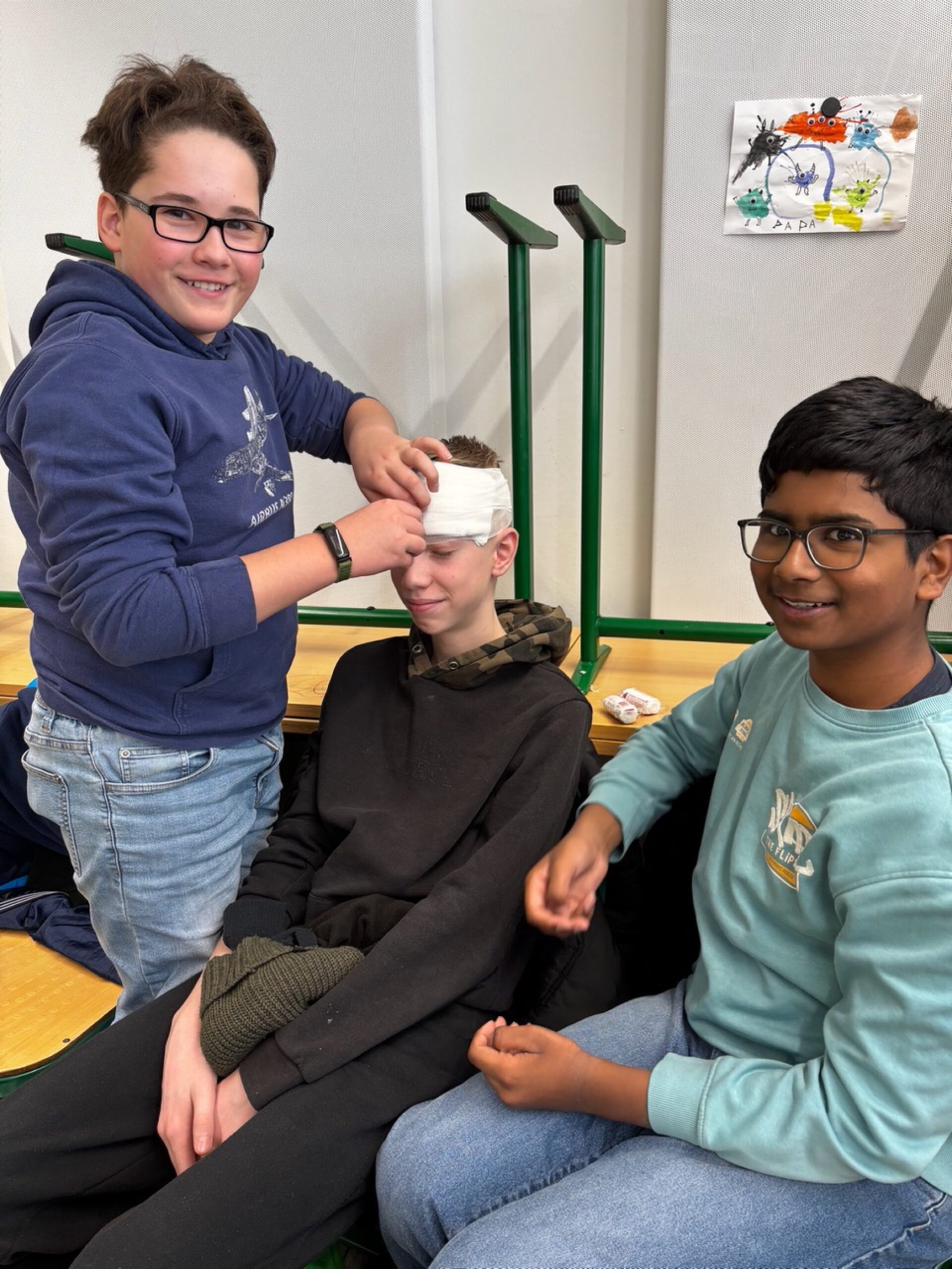 Im 7. Jahrgang stand die Gesundheitsprävention im Mittelpunkt. Unter Anleitung der Intensivmedizinerin Juliane Raack wurde praxisnah vermittelt, wie starke Blutungen fachgerecht versorgt werden. Unterstützt von Mitgliedern des Schulsanitätsdienstes konnten die Schülerinnen und Schüler Verbände anlegen und Sicherheit im Umgang mit Notfallsituationen gewinnen.