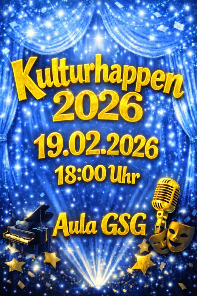 am 19. Februar finden die Kulturhappen am Geschwister-Scholl-Gymnasium statt und wir freuen uns auch in diesem Jahr wieder auf einen abwechslungsreichen Abend! Ab 18 Uhr erwartet Sie und euch ein Programm mit viel Musik, Gesang, Tanz und Schauspiel.